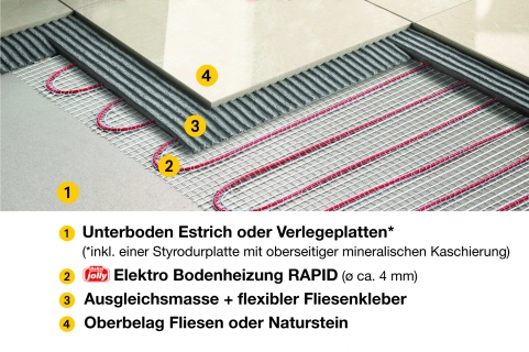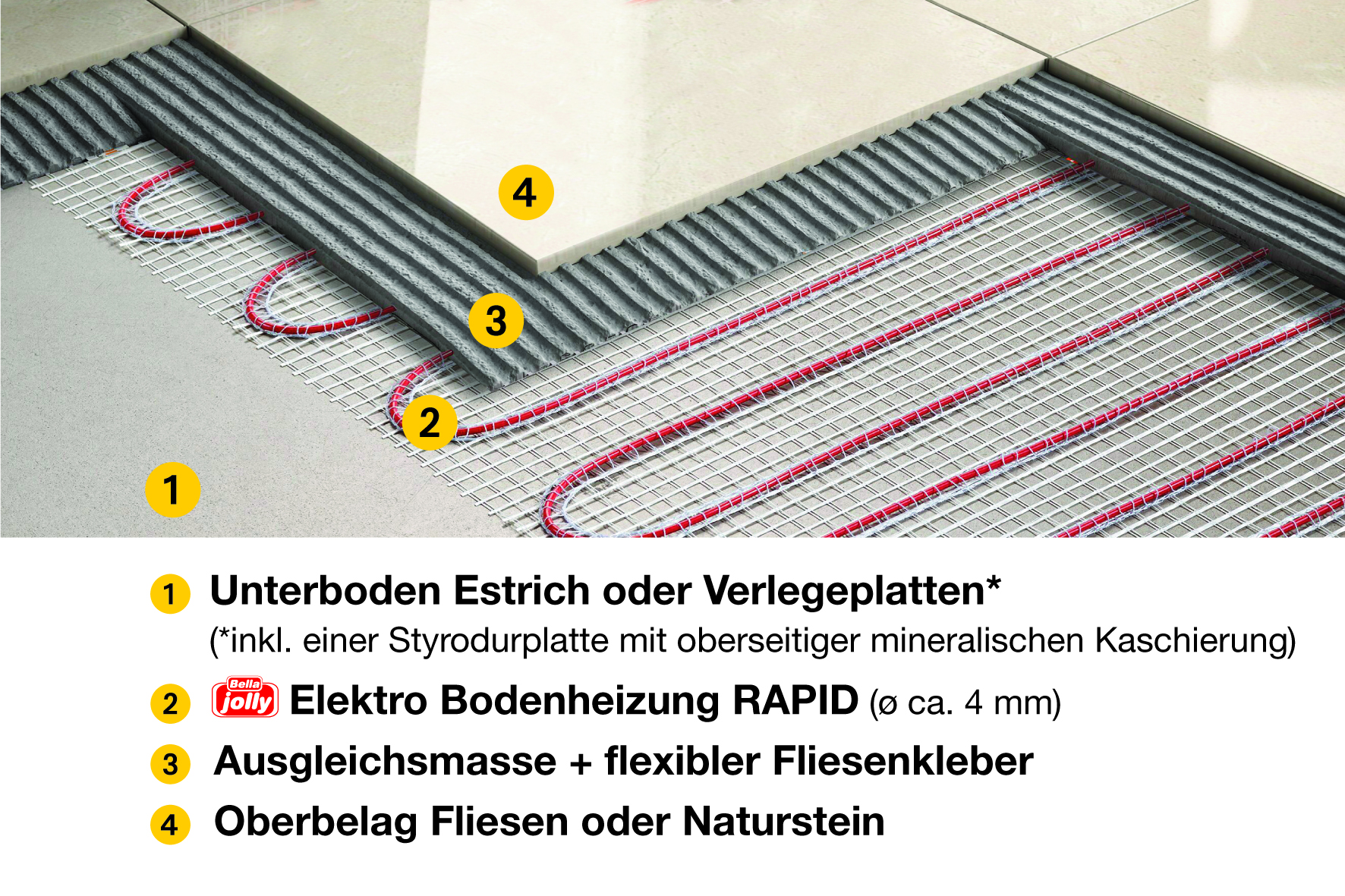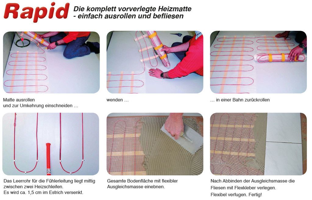 vorverlegtauf GewebegittermatteEine Elektrofußbodenheizung wandelt 100% der zugeführten elektrischen Energie in behagliche Wärme um und ist sparsamer als man üblicherweise denkt! Die Verlegung erfolgt unmittelbar unterhalb der Fliesen, dadurch verkürzt sich die Aufheizdauer drastisch gegenüber einer konventionellen Fußbodenheizung! Durch intelligente Regeltechnik können Laufzeit und Verbrauch minimiert werden! Ideal für Räume mit festen Nutzungszeiten wie z.B. Badezimmer, Wellnessbereiche, Küchen etc. Als vollwertige Raumheizung oder als Zusatzheizung zur Wohnkomfortsteigerung! Verlegung